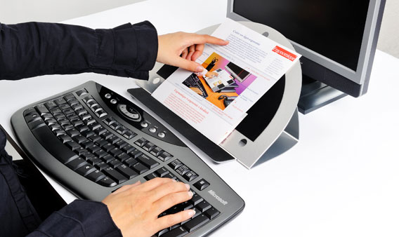 Mit dem ErgoCopy Basic Dokumentenhalter platzieren Sie Ihre Dokument aufrecht vor Ihrem Bildschirm, sodass beim lesen Augen, Nacken und Rücken entlastet werden. Viele Computernutzer arbeiten regelmäßig mit losen Blättern und Dokumenten. Diese liegen oft neben oder vor der Tastatur. Eine gebogene Körperhaltung und ein gekrümmter Rücken sind hierbei unvermeidlich. Auch die Augen werden stark beansprucht. Eine ergonomische Arbeitshaltung ist in dieser Situation unmöglich. Die Lösung ist ein Dokumentenhalter. Mit einem Dokumentenhalter stehen die Dokumente aufrecht vor Ihrem Bildschirm. So sind Dokument und Bildschirm auf einen Blick überschaubar und Ihr Rücken bleibt gerade. Der Winkel des ErgoCopy ist in sechs Positionen verstellbar. Da er sich vollständig zusammenklappen lässt, kann man ihn einfach transportieren. Das robuste Design des Dokumentenhalters von Ergonomique sorgt für ein modernes Aussehen auf dem Schreibtisch.